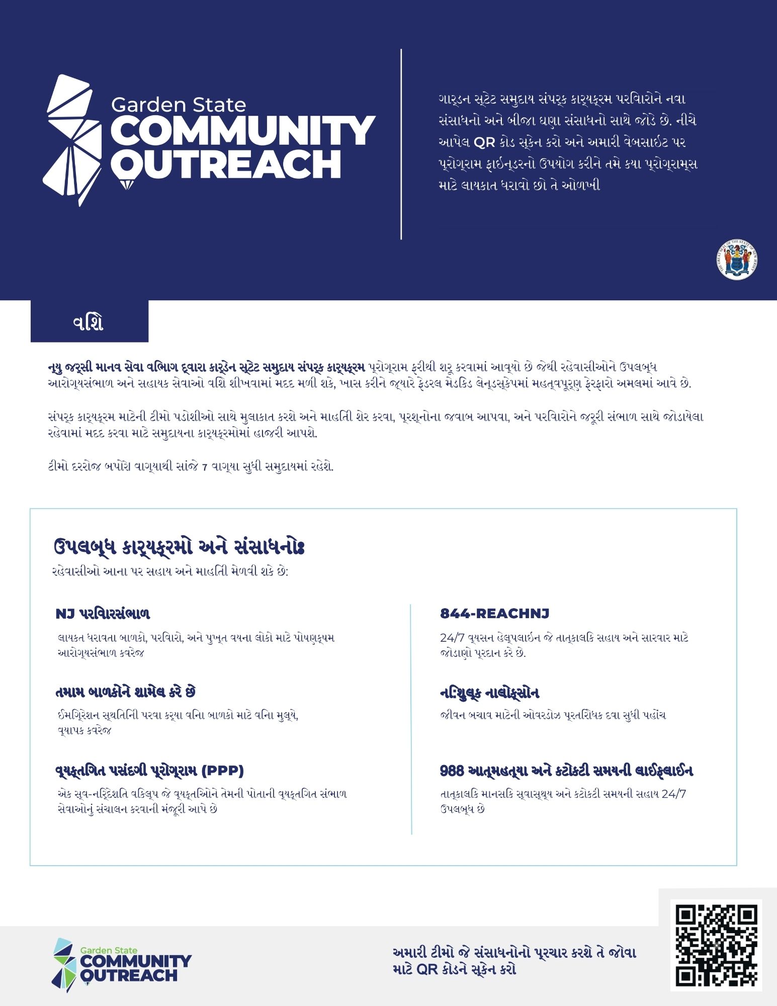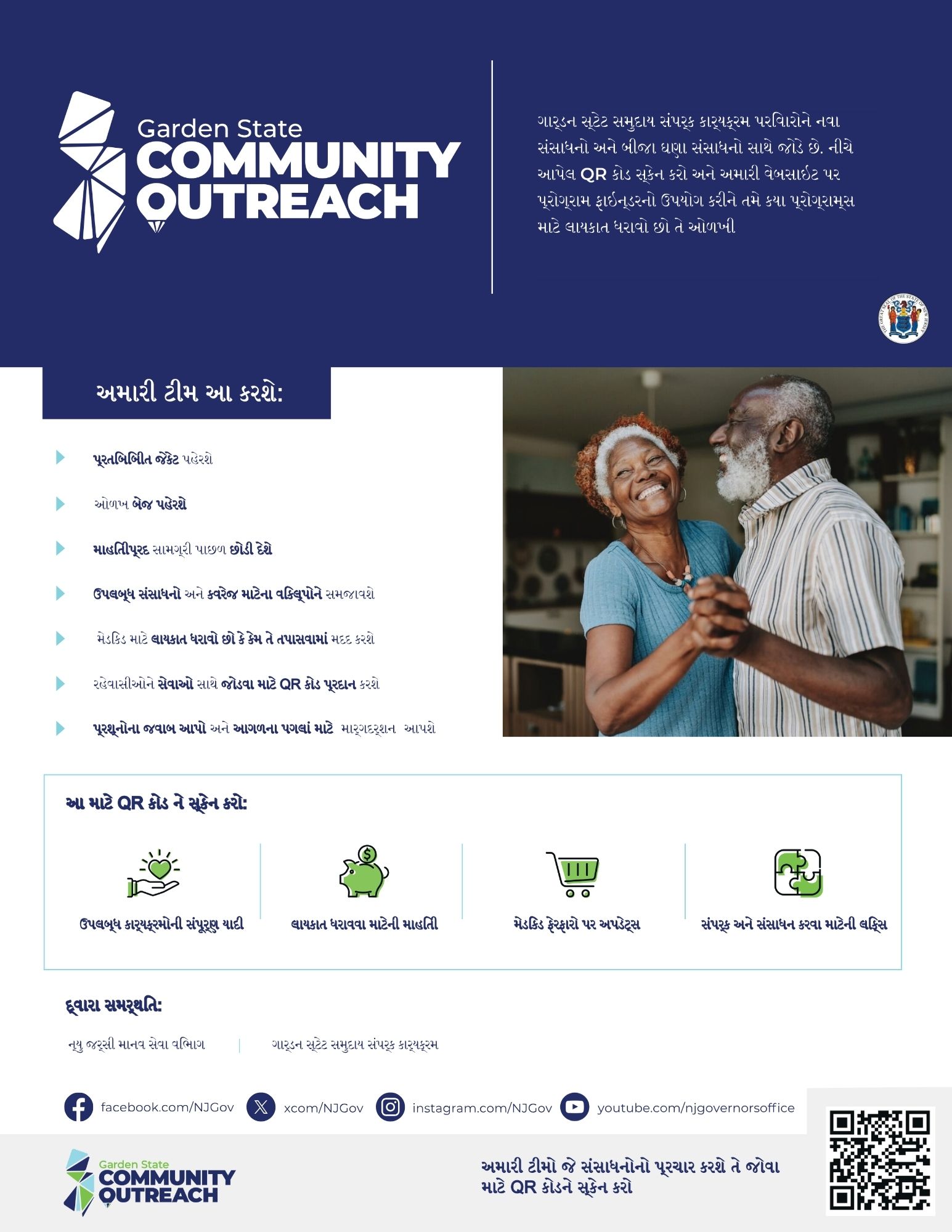 ગવર્નર મર્ફી અને વિધાનસભા દ્વારા બનાવવામાં આવેલ ગાર્ડન સ્ટેટ કોમ્યુનિટી આઉટરીચ, ન્યુ New Jersey રહેવાસીઓને ખર્ચ-બચત અને જીવન બદલતા કાર્યક્રમો સાથે જોડે છે. તમે કયા કાર્યક્રમો માટે પાત્ર હોઈ શકો છો તે ઓળખવામાં મદદ કરવા માટે પ્રોગ્રામ ફાઇન્ડરનો ઉપયોગ કરો.